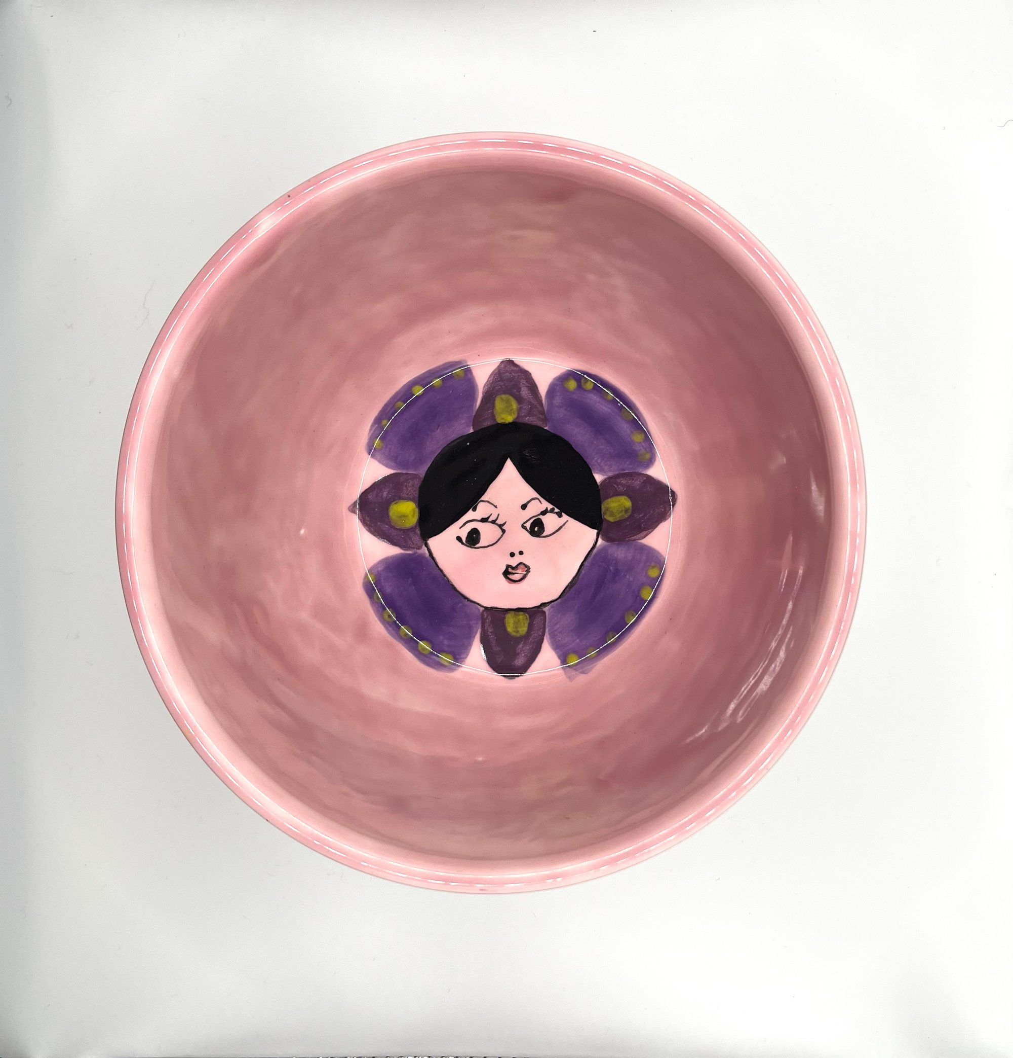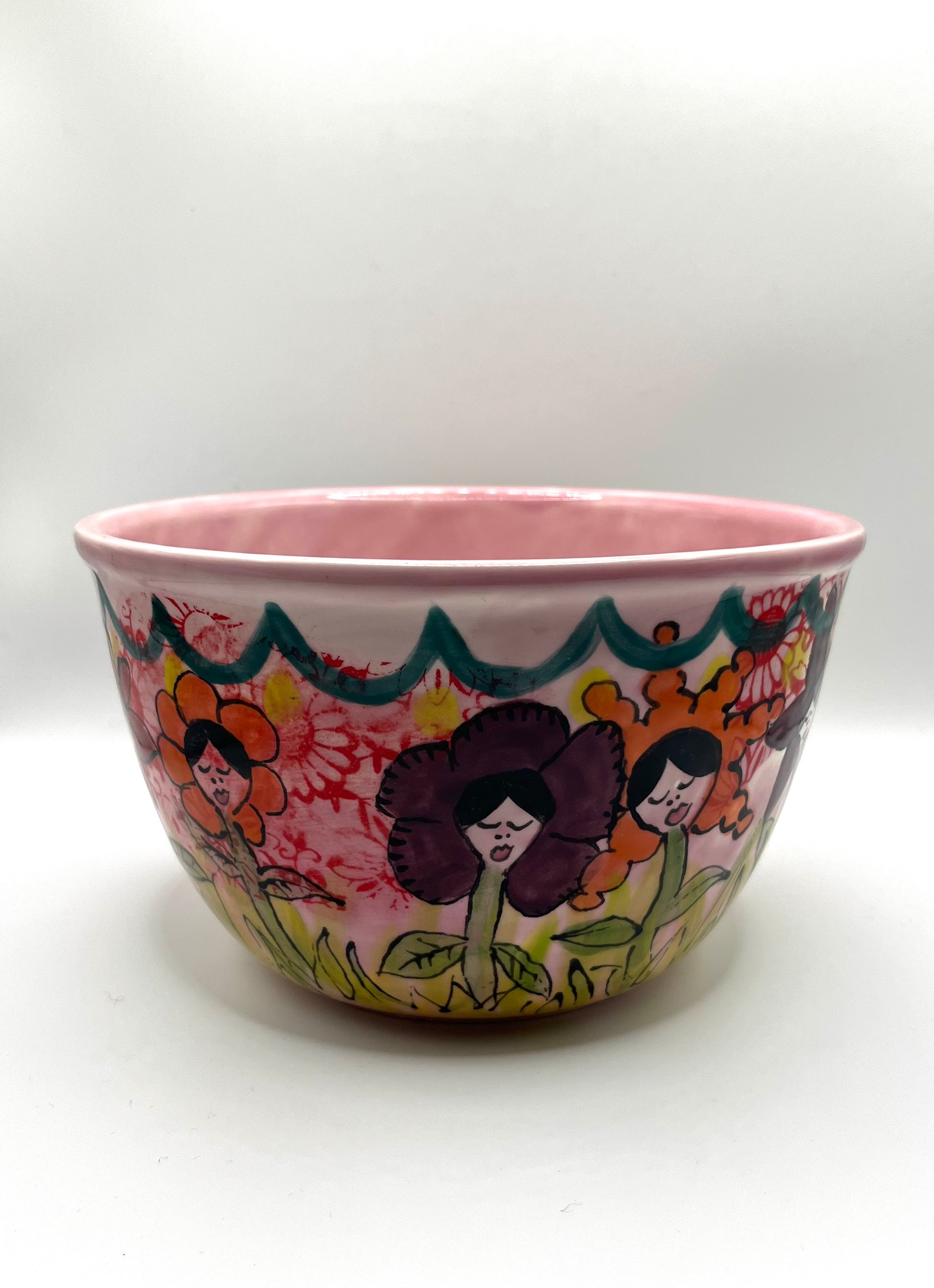 Stoneware mixing bowl, brightly decorated with garden party ladies.