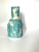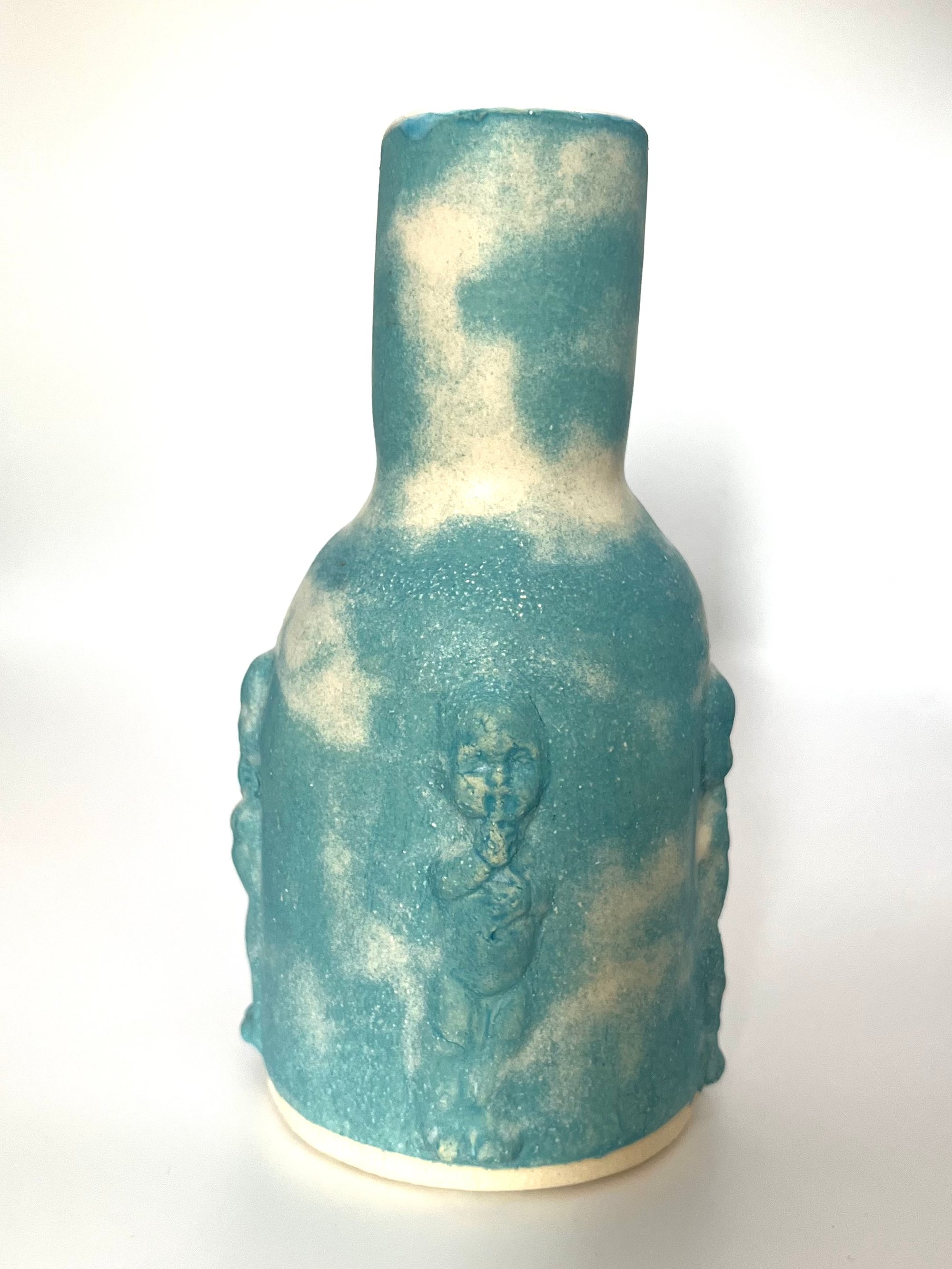 Slab and coiled stoneware vase with 4 sprig moulded babies. Interesting glazed matt finish.